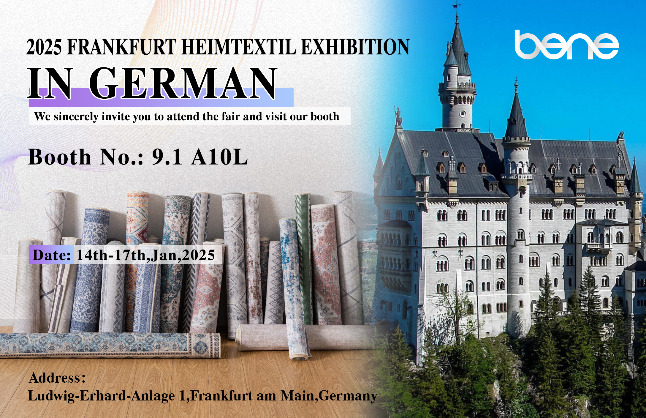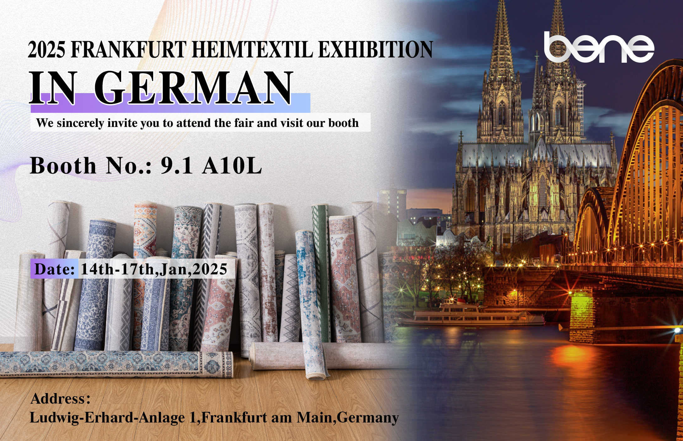 Ang Zhejiang Benyi Textile Technology Co, Ltd, isang nangungunang makabagong enterprise ng tela, ay pinarangalan na ipahayag ang aming pakikilahok sa darating na 2025 na eksibisyon ng Frankfurt HeimTextil. Ang eksibisyon ay magaganap mula Enero 14 hanggang ika -17, 2025, at ipapakita namin ang aming pinakabagong mga karpet, rug na tela, at natapos na mga produkto sa Booth No. 9.1A10L. Taos -puso kaming inaanyayahan na bisitahin ang aming booth at talakayin ang mga makabagong teknolohiya ng tela at mga uso sa industriya sa amin.