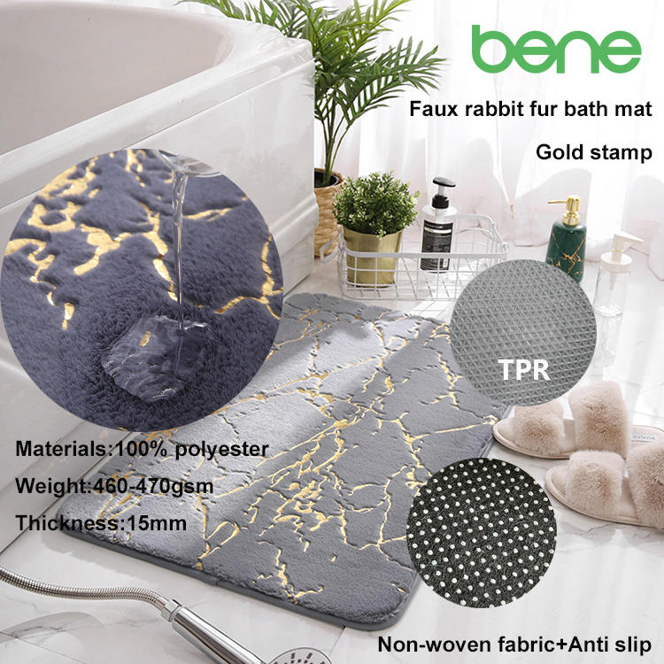 Sa mga tuntunin ng aesthetics, ipinagmamalaki ng banig ang isang solidong pattern ng kulay na may isang natatanging faux rabbit fur texture na sinamahan ng mga eleganteng gintong foil accent, pagdaragdag ng isang ugnay ng luho sa anumang silid. Ang mga espesyal na tampok nito, kabilang ang mga katangian ng hindi slip, lambot, paghuhugas, at pagsipsip ng tubig, gawin itong parehong praktikal at naka-istilong pagpipilian para sa pagpapahusay ng iyong puwang.